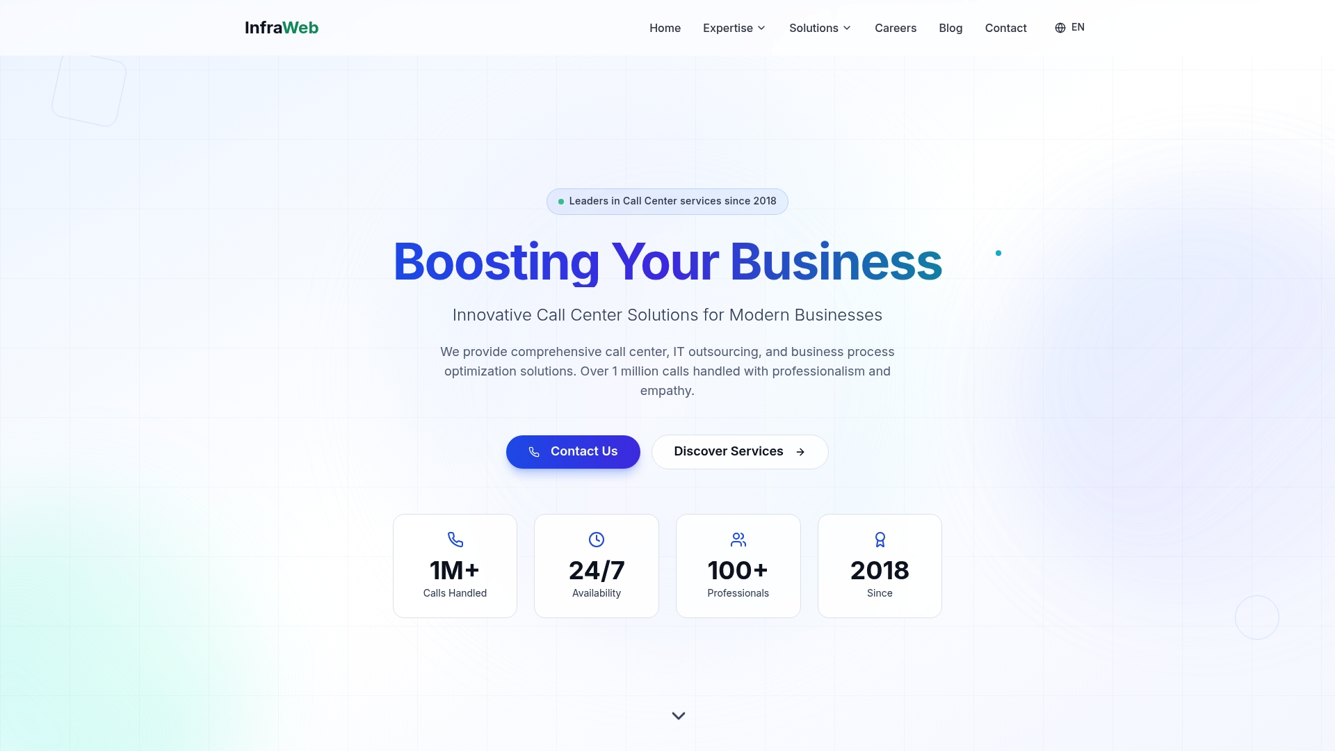 InfraWeb ofrece soporte multilingüe en English, Română, Español y Français junto con soporte técnico 24/7 y servicio de helpdesk. También proporciona servicios BPO completos y servicios IT gestionados que cubren monitorización, red y seguridad de endpoints. Todas las ofertas se adaptan a sectores como utilities, finance, healthcare y e-commerce.