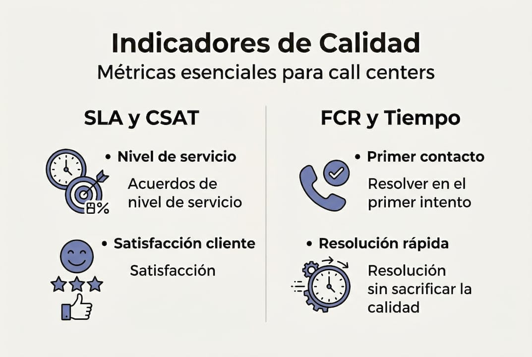 Los principales son los SLA y CSAT para medir calidad objetivamente, junto con el FCR (resolución en primer contacto) y la tasa de abandono de llamadas.